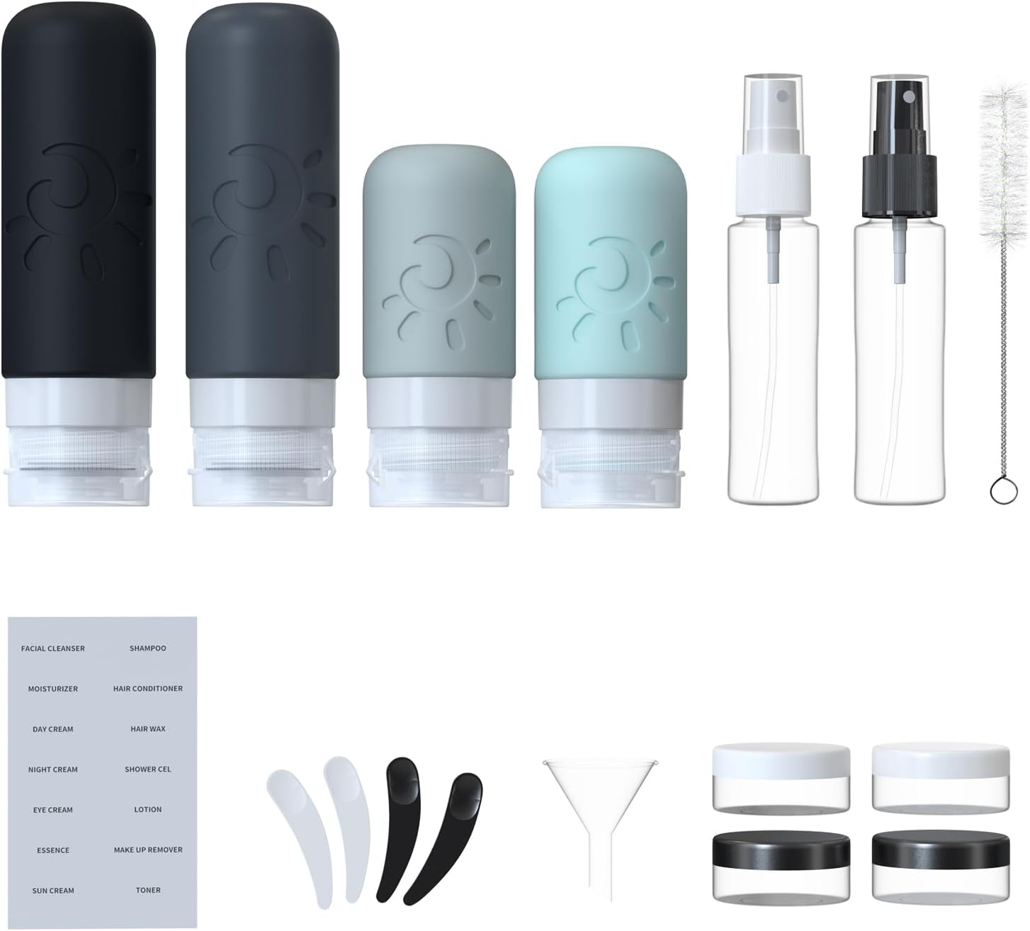 【Multi-combination Set】The travel container set includes 4 travel bottles, 4 travel jars, 2 spray bottles, 4 spoons, 1 funnel, 1 cleaning brush, and 1 label, as well as 1 transparent makeup bag. They are portable and lightweight, easy to carry and clean. perfect for business or personal travel, and fun outdoors.
