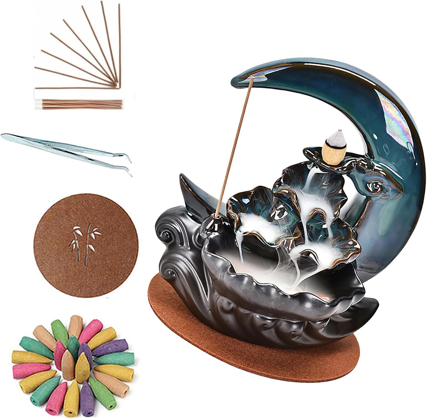 Ceramic Hand-Made New Moon Backflow Incense Holder with Cones and Sticks - Aromatherapy Home Decor & Fountain Burner Set with Fragrance Cones & Mat
