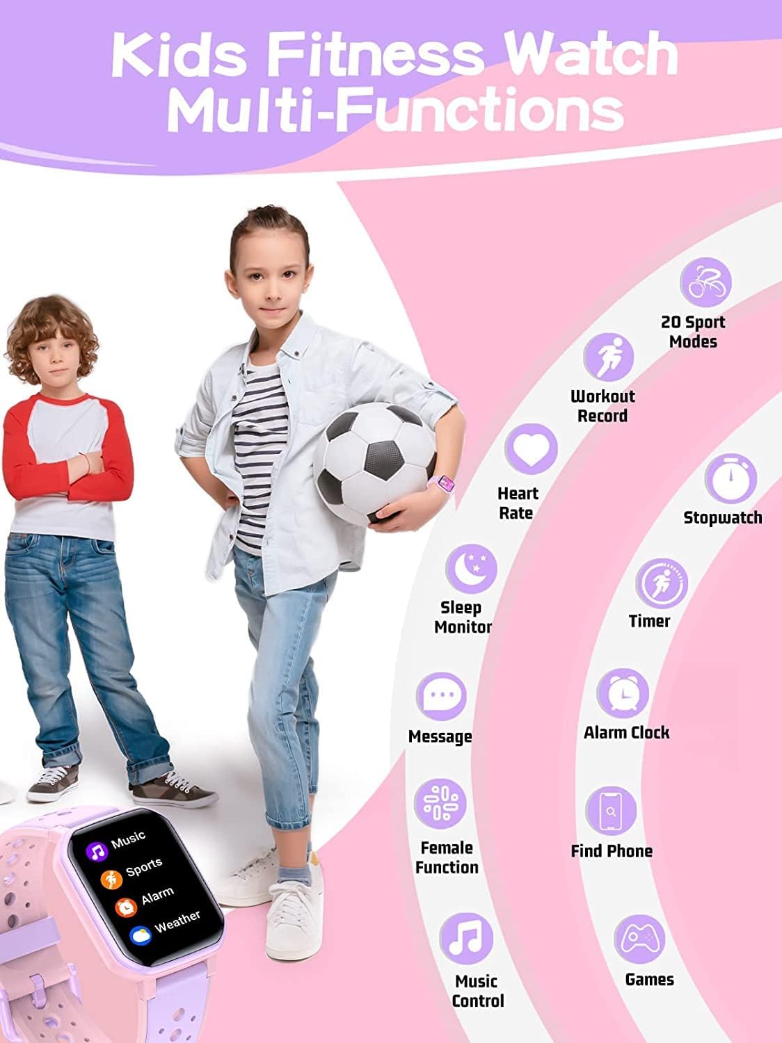 【Kids Sport Activity Tracking】The Kids fitness tracker watch equipped with 20 sport modes, such as running, walking, biking, swimming, various sports and ball games. Record various exercise data, such as calories burned, distance exercised during exercise. Use data to better manage kids workouts and meet the diverse sports needs of children. The watch is also waterproof so it can be used while swimming.